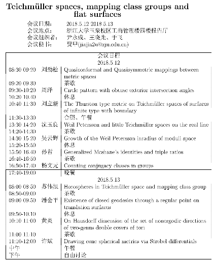学术科研 学术团队 学术活动 学术会议 学术报告 讨论班 School Colloquium 信息公告 文件汇编 学术活动 华体会在线 > Teichmüller spaces, mapping class groups and flat surfaces 来源:华体会(中国) 发布时间:2018-04-17 1719 会议日期: 2018.5.12-2018.5.13会议地点:浙江大学玉泉校区工商管理楼四楼报告厅会议组织者:尹永成、王晓光、于飞会议秘书:贾甲(jiajia2u@zju.edu.cn)标题和摘要,请见附件:标题和摘要.pdf