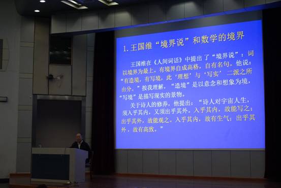 其后,严加安院士在同学们的热烈掌声中正式开始了本次讲座。严加安院士先是感谢了包刚院长的隆重介绍和各位老师同学的热情出席。他首先从王国维的“境界说”开始谈起,将文学中的“造境”和“写境”分别类比数学研究中的“创造理论”和“解决难题”,并将王国维的治学三重境界翻译为“志存高远,艰苦探索,最终顿悟”的三个研究层次。这些生动具体的类比,将国学治学和数学研究相互结合,展现了数学研究的诗意一面。所以,当严加安院士谈及“数学是一门精美的艺术”之时,同学们鼓起了热烈的掌声。
