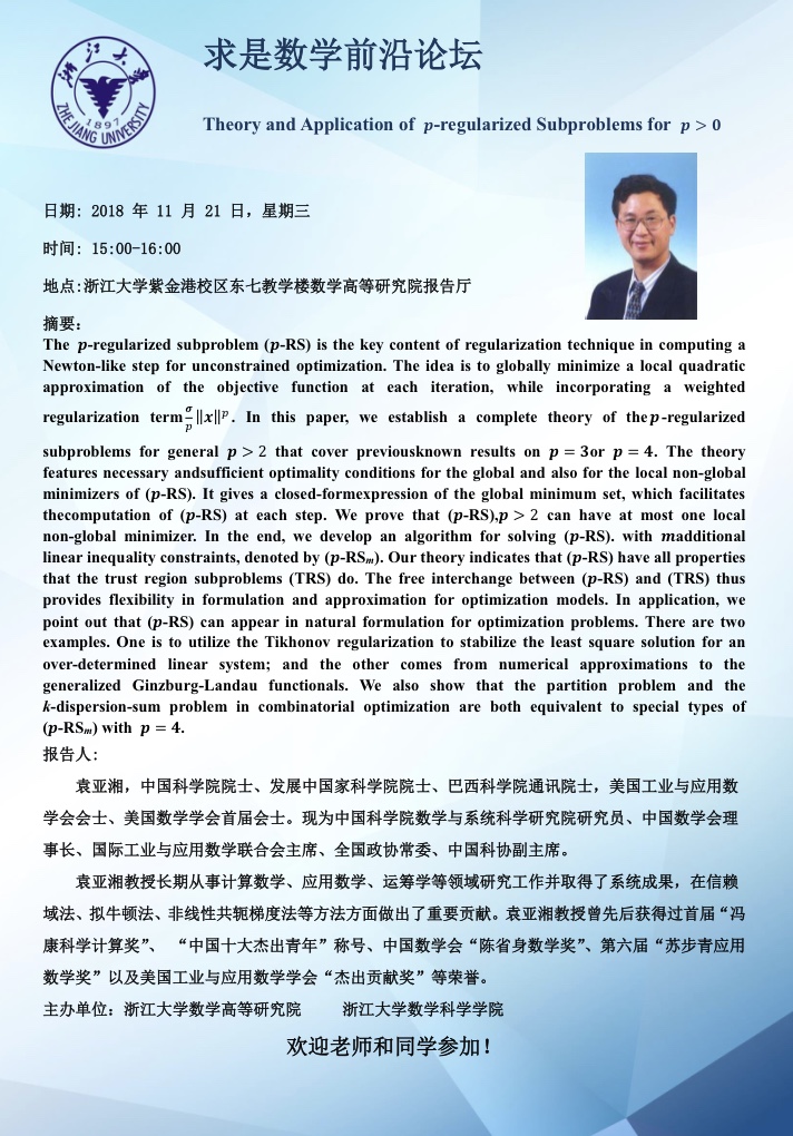 学术科研 学术团队 学术活动 学术会议 学术报告 讨论班 School Colloquium 信息公告 文件汇编 2018 华体会在线 > 求是数学前沿论坛之袁亚湘院士讲座 来源:华体会(中国) 发布时间:2018-11-20 783