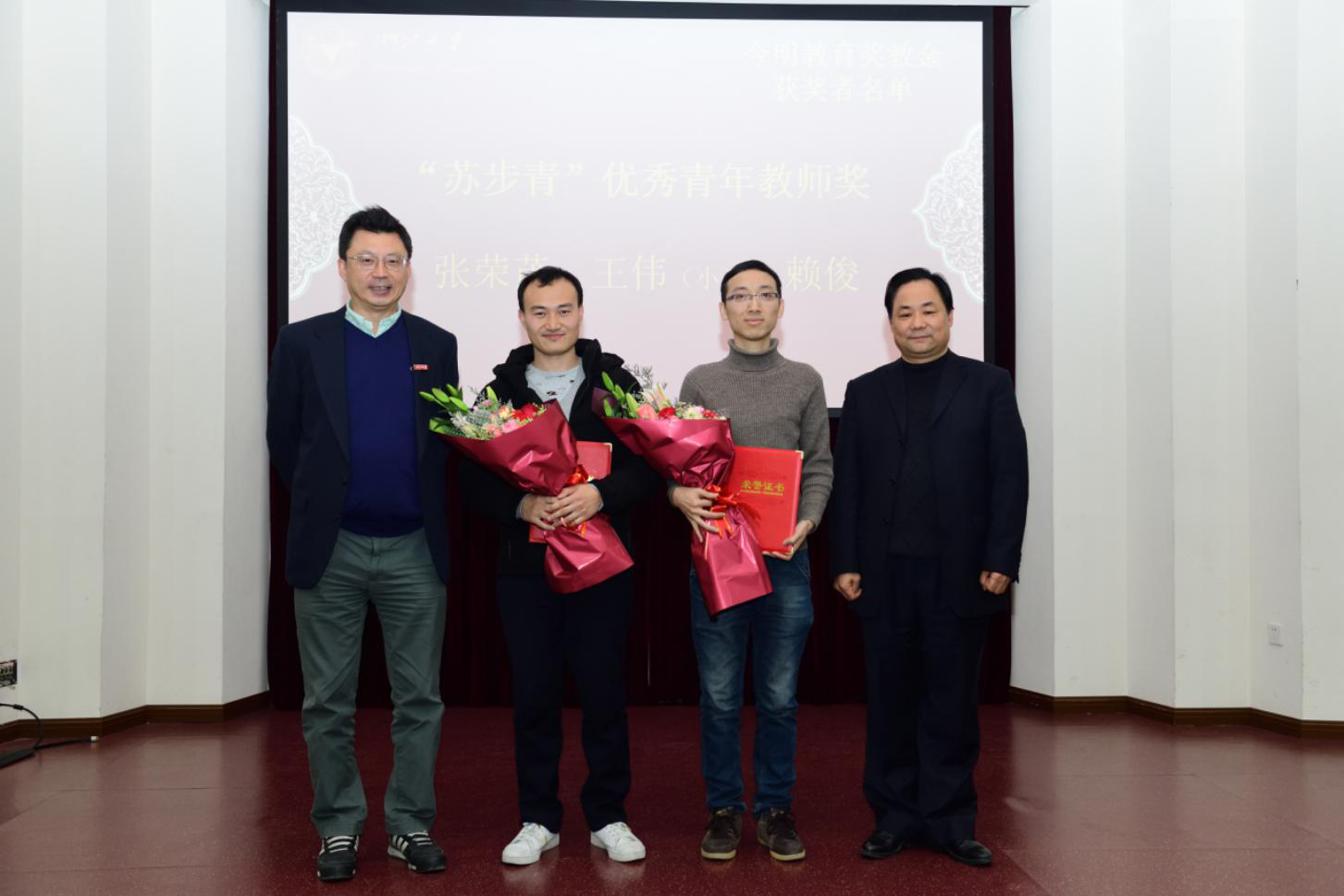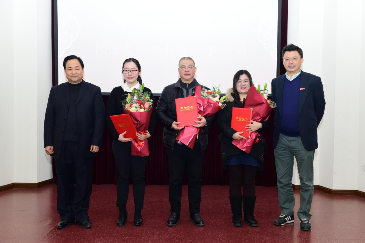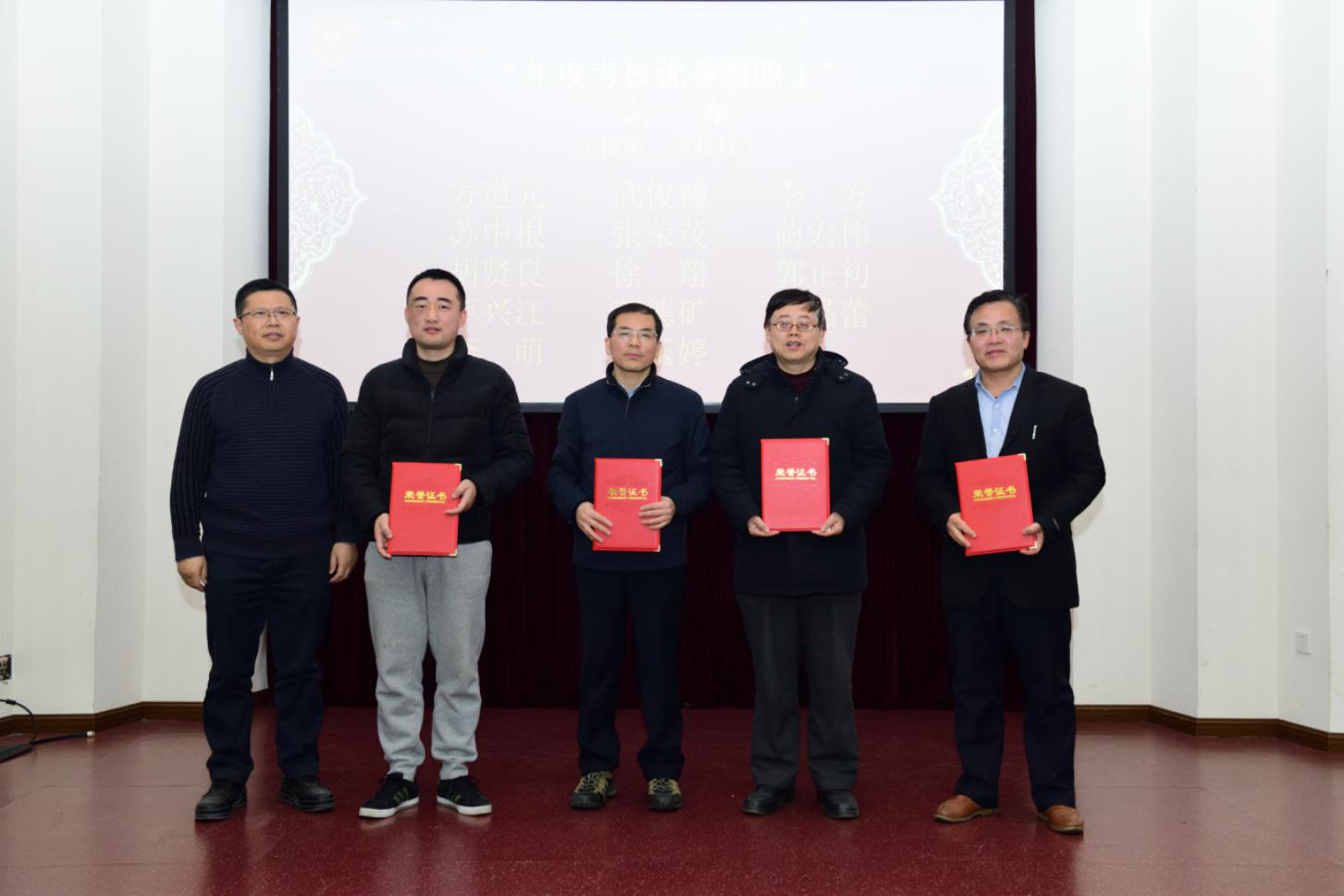接下来是表彰大会。在过去的一年里,学院教职工勤恳奋进,团结协作,攻坚克难,将学院的发展推向了一个新的高度的同时,也涌现了一批先进个人。姚晨副书记依次宣读了学院2018年度表彰名单,学院领导和今明教育集团董事长杨益民先生为获得奖励的教职工颁发了荣誉证书并合影留念。