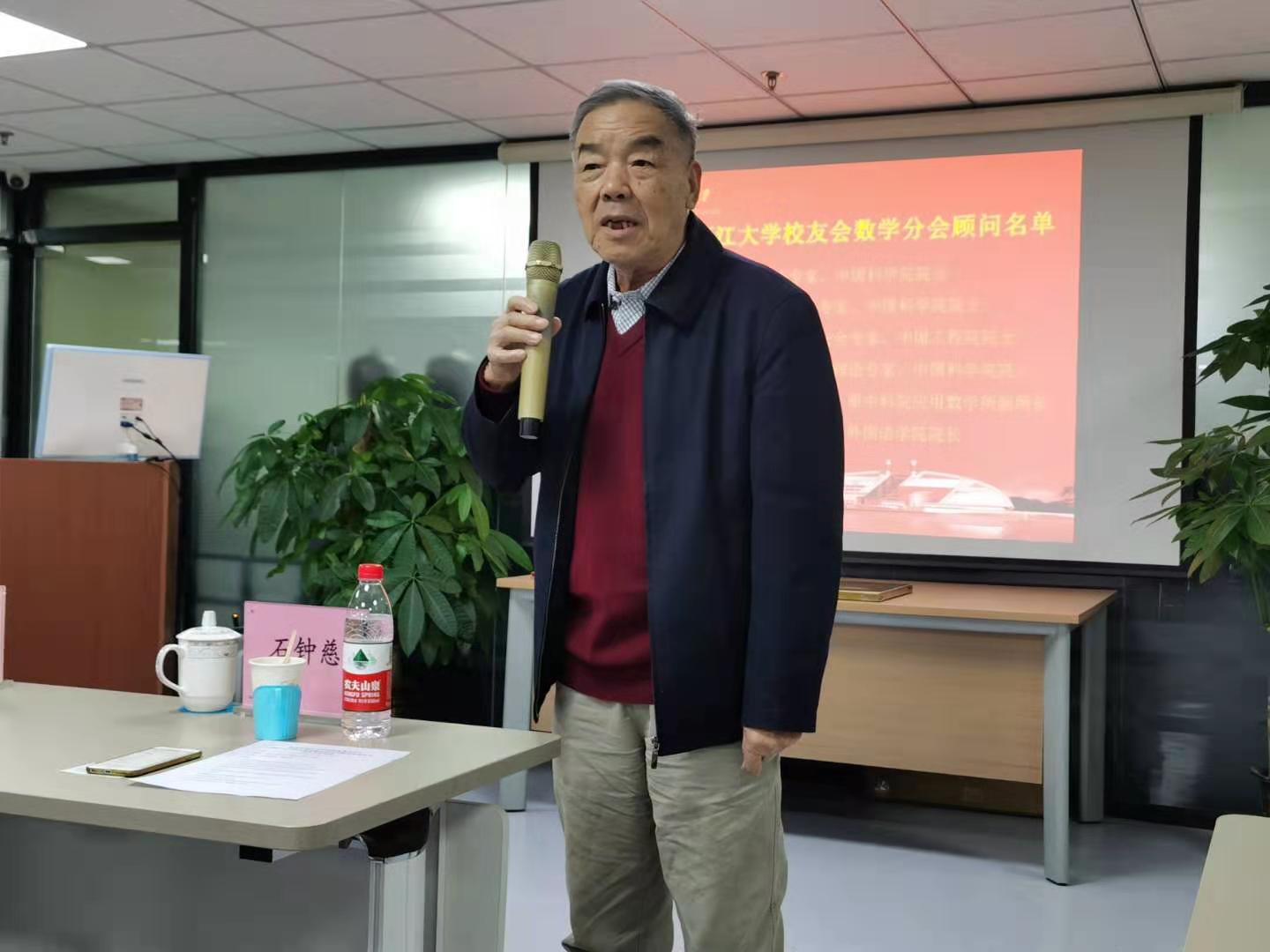 仪式后,石钟慈院士作为顾问代表讲话。他首先祝贺浙大北京校友会数学分会的成立,并讲述了在浙大精神的鼓舞下那些激情燃烧的岁月,尤其是1951年缘起浙大、随同院系调整、师从陈建功先生科研等激动人心的经历,饱含激情地表述了对浙大的热爱。他指出,华体会(中国)作为浙大名片,秉承“求是”精神,人才辈出,必将在创建世界一流学科中获得更大发展。石院士谈了对校友会的认识,对分会的成立给予充分肯定,他期待北京浙大校友会数学分会能够充分发挥纽带作用,加强母校和校友之间的联系。