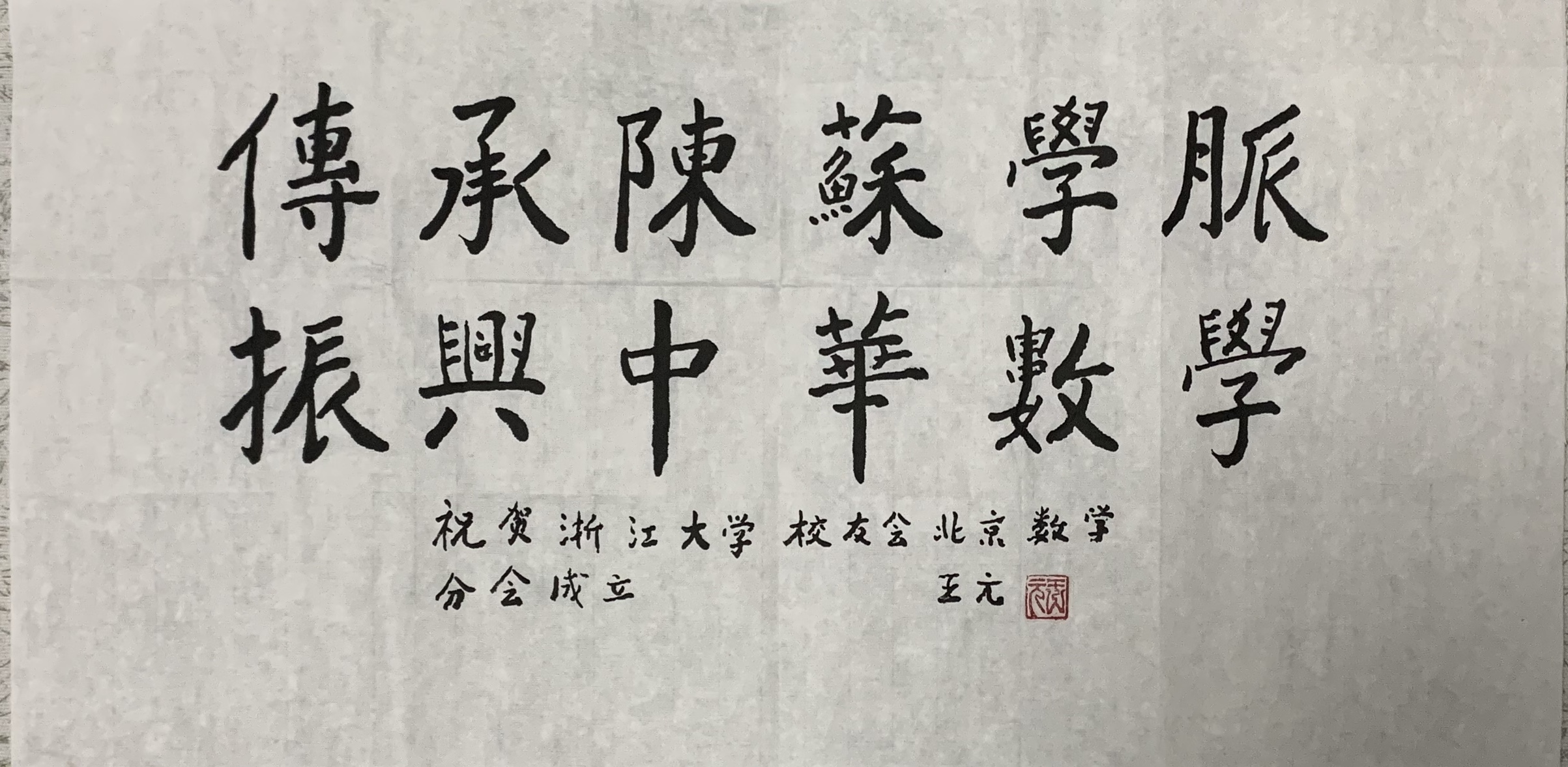 筹建数学分会自2018年8月开始,8月中旬,华体会(中国)院长包刚、党委书记闻继威、党委副书记姚晨专程到北京约见在京的校友代表,并成立了筹备组。之后筹备组组织校友探访校友代表,包括浙大华体会(中国)杰出校友王元院士、石钟慈院士、原杭大副校长,浙大数学奠基人之一陈建功先生之子陈翰馥院士等。王元院士对分会的成立欣然题词“传承陈苏学派 振兴中华数学”。