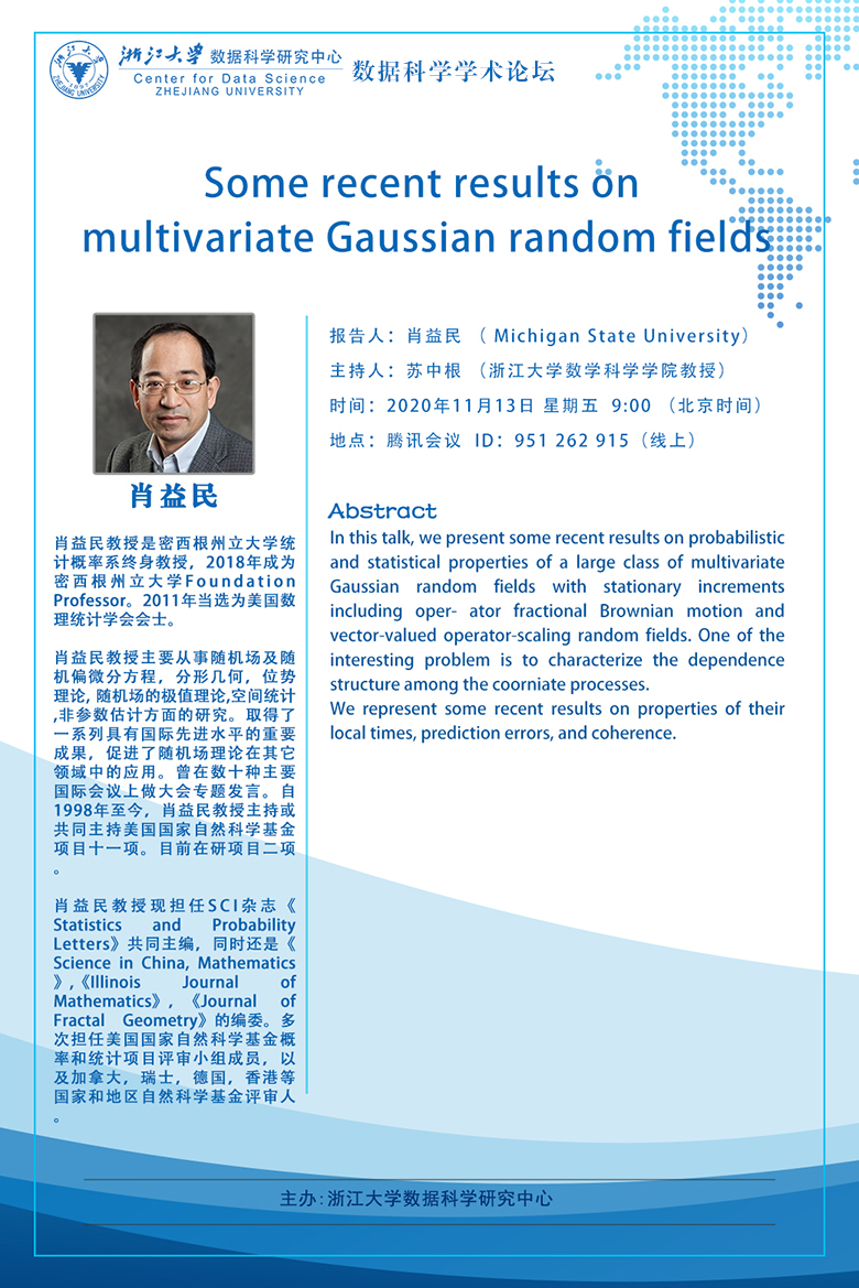 学术科研 学术团队 学术活动 学术会议 学术报告 讨论班 School Colloquium 信息公告 文件汇编 2020 华体会在线 > Some recent results on multivariate Gaussian random fields 来源:华体会(中国) 发布时间:2020-11-06 453