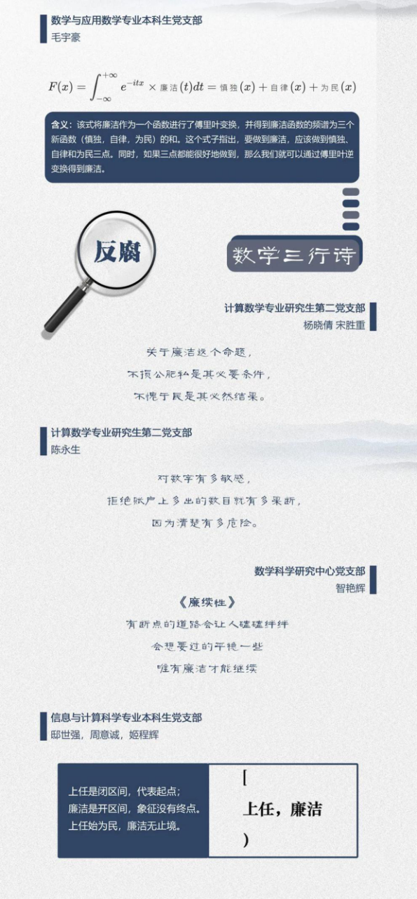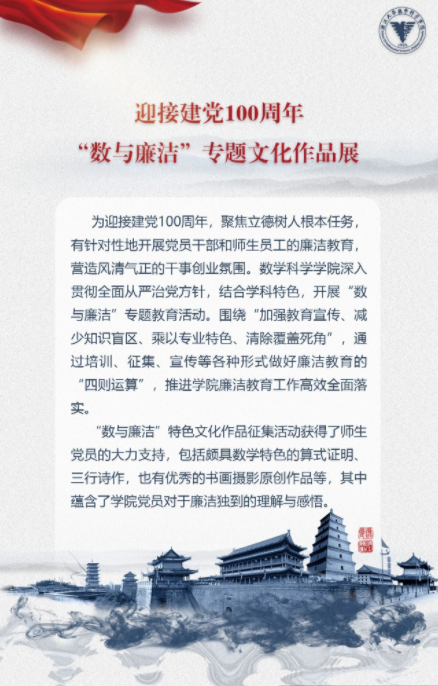 党群学工 党委概况 党建工作 文件汇编 团学通知 团学新闻 就业信息 评奖评优 学生资助 学生文件资料 规章制度 教工之家 团学新闻 华体会在线 > 【迎接建党100周年】华体会(中国)“数与廉洁”专题文化作品展 来源:华体会(中国) 发布时间:2021-01-26 151
