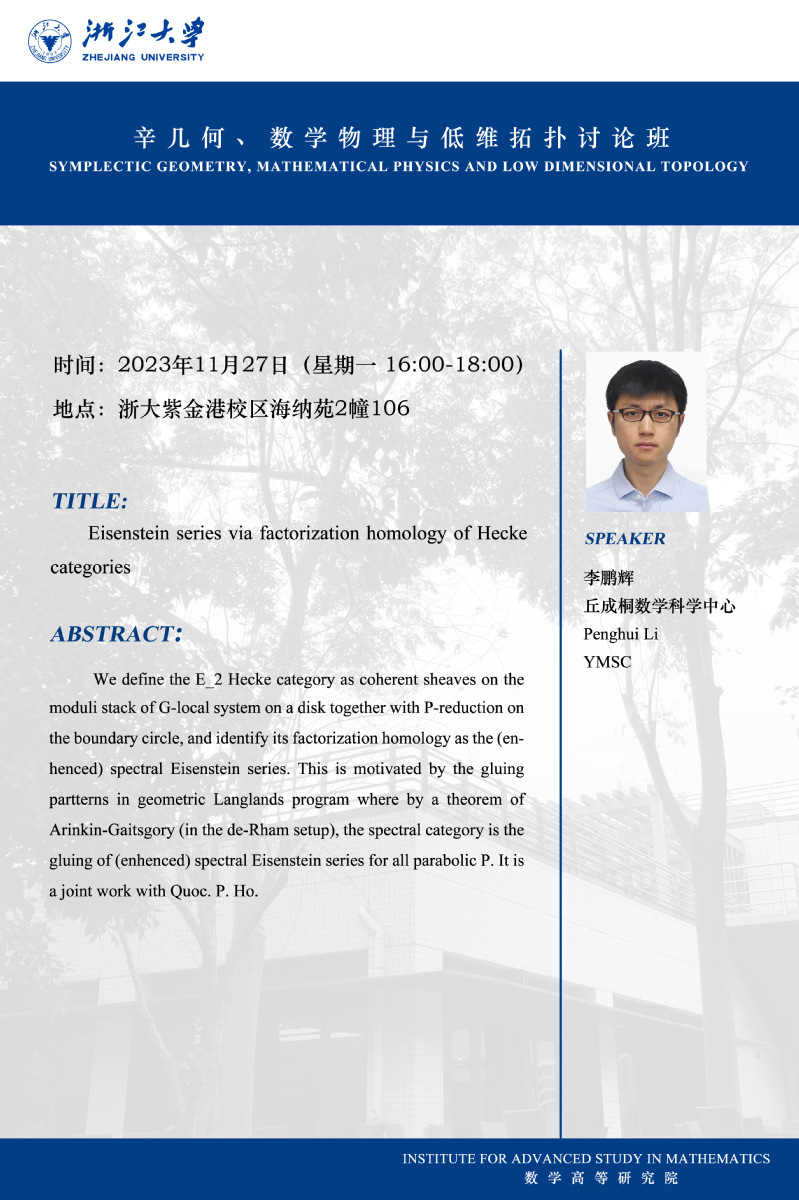 学术科研 学术团队 学术活动 学术会议 学术报告 讨论班 School Colloquium 信息公告 文件汇编 辛拓扑与物理讨论班 华体会在线 > 辛拓扑与物理讨论班——Eisenstein series via factorization homology of Heckecategories 来源:华体会(中国) 发布时间:2023-11-27 295