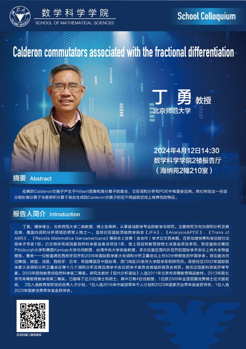 学术科研 学术团队 学术活动 学术会议 学术报告 讨论班 School Colloquium 信息公告 文件汇编 School Colloquium 华体会在线 > School Colloquium——Calderon commutators associated with the fractional differentiation 来源:华体会(中国) 发布时间:2024-04-07 402