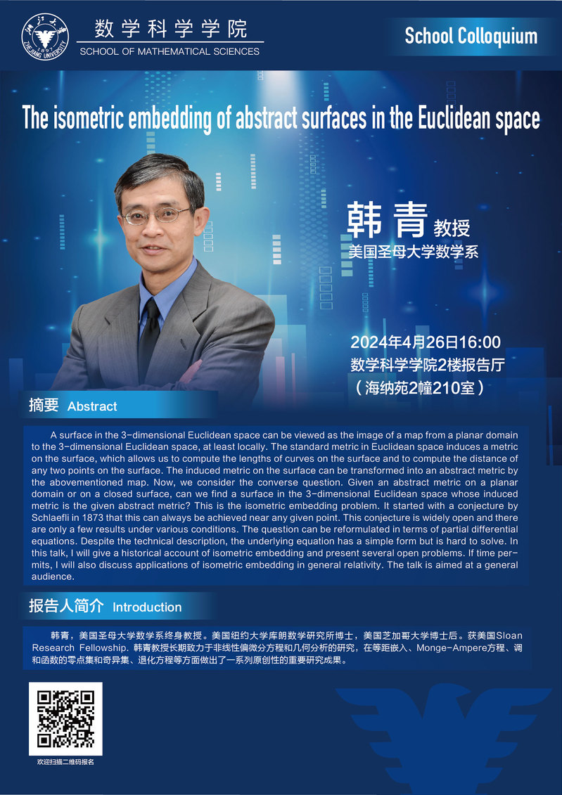 学术科研 学术团队 学术活动 学术会议 学术报告 讨论班 School Colloquium 信息公告 文件汇编 School Colloquium 华体会在线 > School Colloquium——The isometric embedding of abstract surfaces in the Euclidean space 来源:华体会(中国) 发布时间:2024-04-19 445