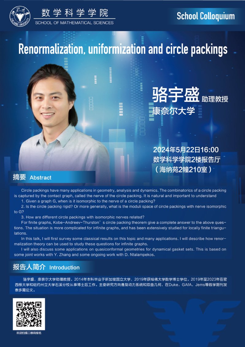 学术科研 学术团队 学术活动 学术会议 学术报告 讨论班 School Colloquium 信息公告 文件汇编 School Colloquium 华体会在线 > School Colloquium——Renormalization, uniformization and circle packings 来源:华体会(中国) 发布时间:2024-05-14 345