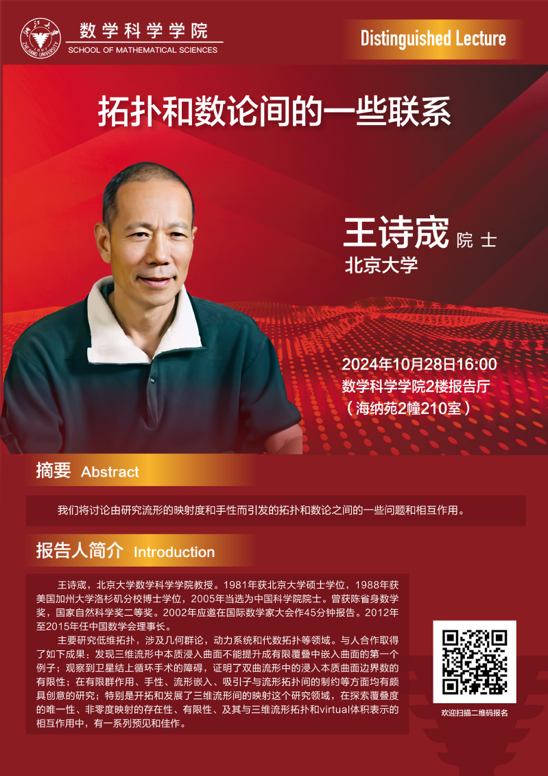 学术科研 学术团队 学术活动 学术会议 学术报告 讨论班 School Colloquium 信息公告 文件汇编 School Colloquium 华体会在线 > Distinguished Lecture——拓扑和数论间的一些联系 来源:华体会(中国) 发布时间:2024-10-25 332