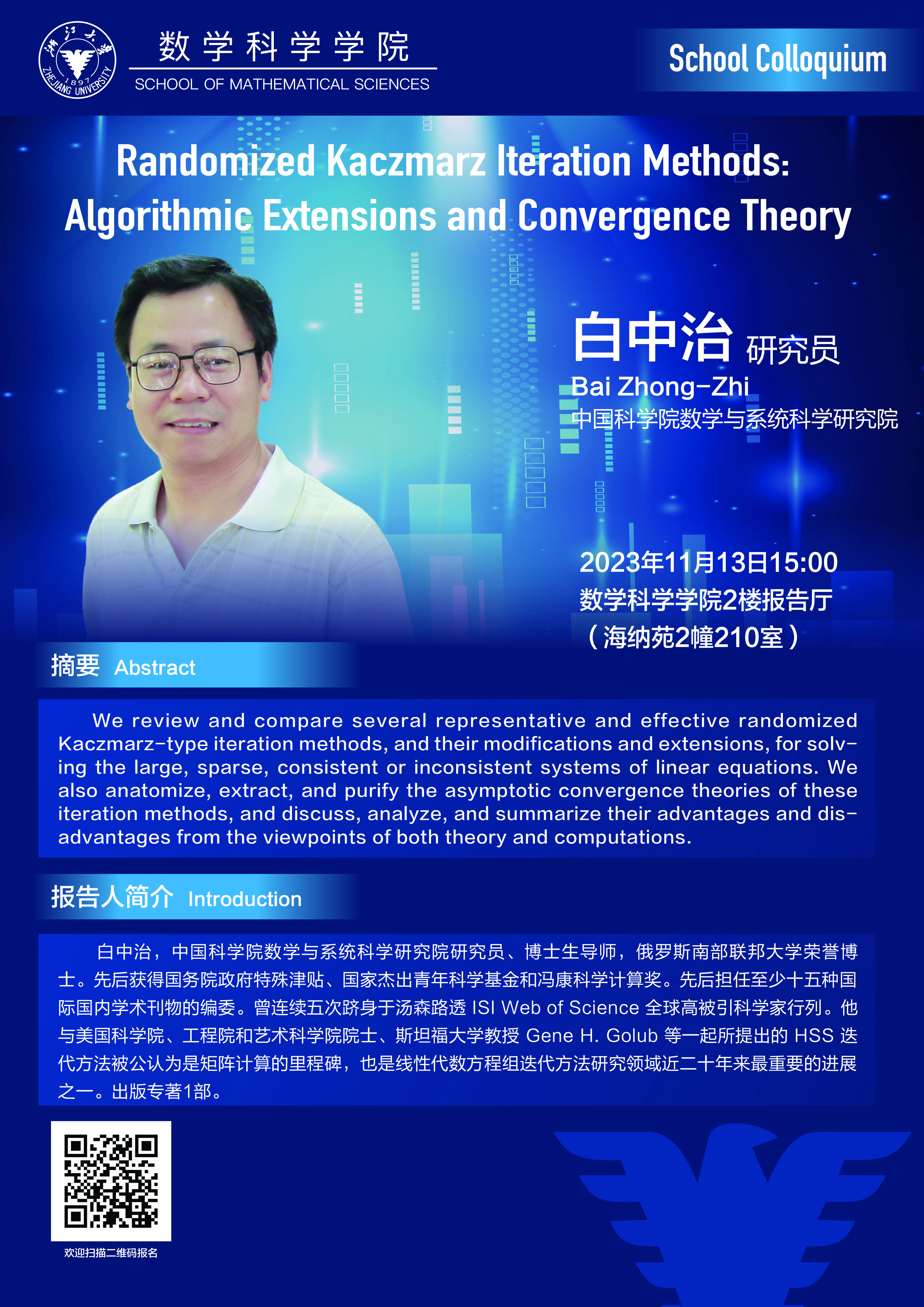 School Colloquium——Randomized Kaczmarz Iteration Methods: Algorithmic Extensions and Convergence Theory